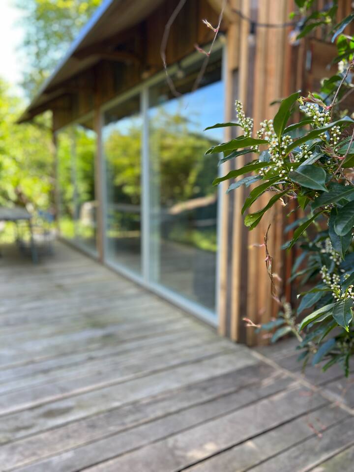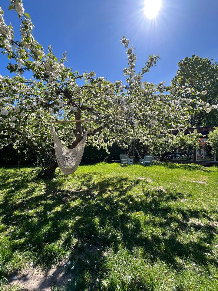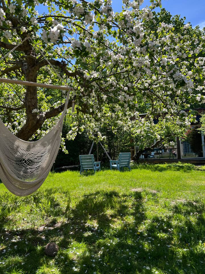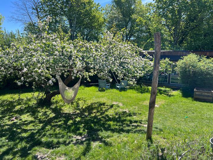 Პრიმიტიული ხის სახლი საზიარო ბაღში, იდეალურ ადგილას