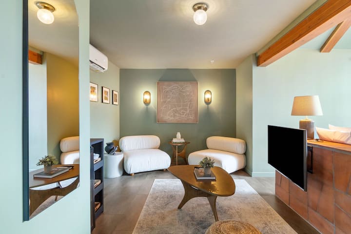 The thoughtfully curated interior blends the urban edge of industrial design with the warmth of modern minimalism. Natural textures, bold brick, and the perfect shade of grounding green bring a sense of harmony and connection to the desert landscape just beyond your door. This studio suite offers one bedroom and one bathroom, and comfortably accommodates up to two guests in understated luxury.