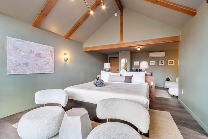Living/Sleeping Area: The open-concept layout includes a Smart TV, two plush chairs, and a soft lounge chair perfect for reading. The queen-sized bed faces scenic views and the artfully eclectic wood wall adds texture and depth to the calming ambiance.