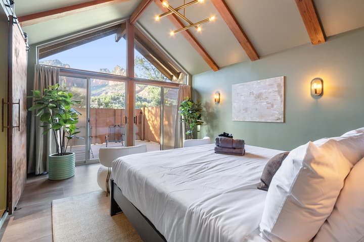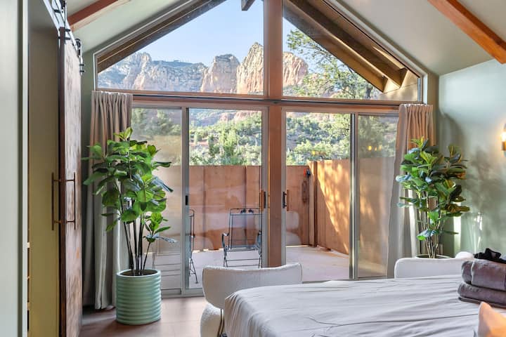 Step inside to discover a sun-soaked lounge and sleeping area with large windows that frame stunning red rock views. A charming exposed brick wall subtly separates the living space from the bedroom, while a custom iron barn door leads to a serene bathroom complete with a rain shower and spa-like finishes.