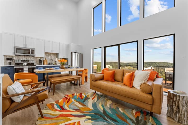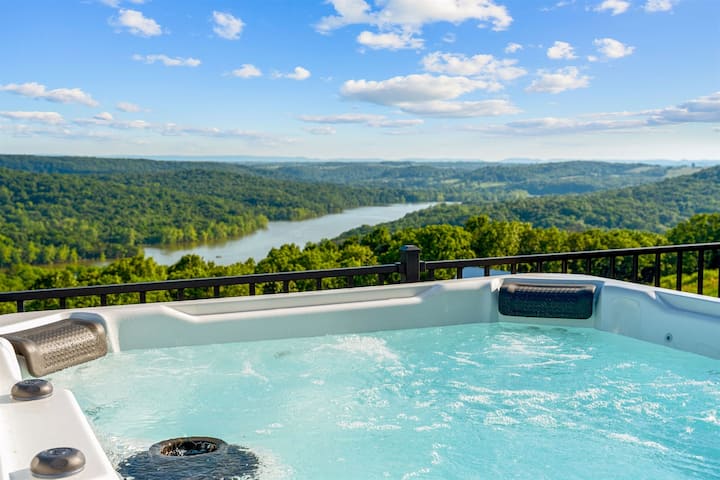 ✨Skyline Horizon by Relax and Renew Rentals: LUXURY 3BR/3BA new-build with game room + outdoor heaven, located above Table Rock Lake in Omaha, AR. Განსაცვიფრებელი ხედები იატაკიდან ჭერამდე 30 ფუტიანი ფანჯრებით, ტბის პანორამული ხედებით, ცალკე გათბობით/გაგრილებული ზღვის აუზით და მზის თაროებით, ჰიდრომასაჟიანი აუზით, გურმანების სამზარეულოთი და ცეცხლის მაგიდით გემბანზე. Სპა-შთაბეჭდილება 6 ფუტი სიღრმის აბაზანითა და წვიმის საშხაპით. Ფეხით ტბამდე. 10 წუთი კლდის მწვერვალამდე, პეინის ხეობამდე და თუნდერ-რიჯამდე; 20 წუთი ბრენსონ ‑ ლენდინგამდე.