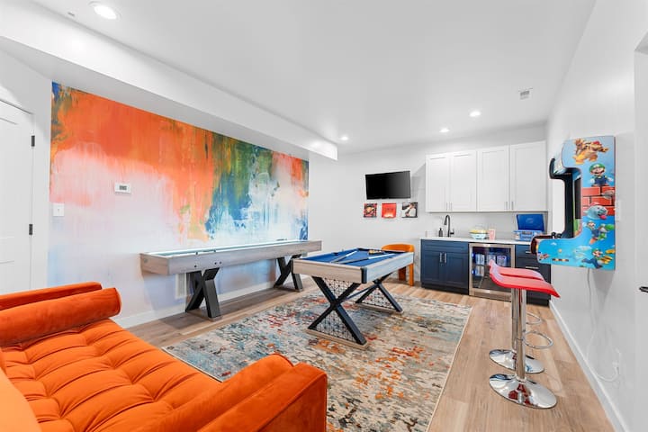 🎱 Სათამაშო ოთახი შაფლბორდით, აუზის მაგიდით, არკადით, სმარტ-ტელევიზორითა და კაბინის დივნით