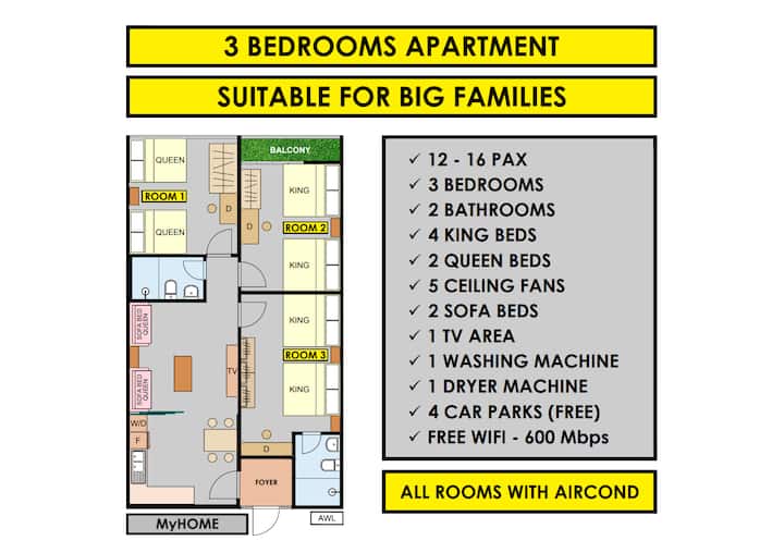 Bukit Bintang 12-16pax 3BR +2Bath (ახლადგარემონტებული)