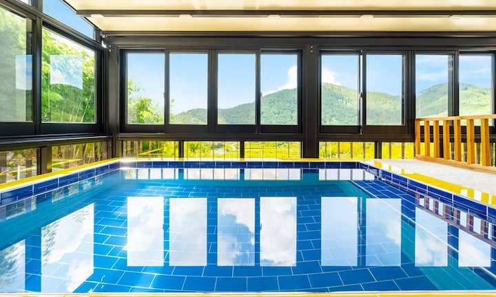 Ეს არის კერძო აუზიანი ვილა ოთხსეზონიანი ცხელი წყლით და ინდივიდუალური ტერასით 2021 წლის ივლისში აშენებულ ყველა ოთახში.