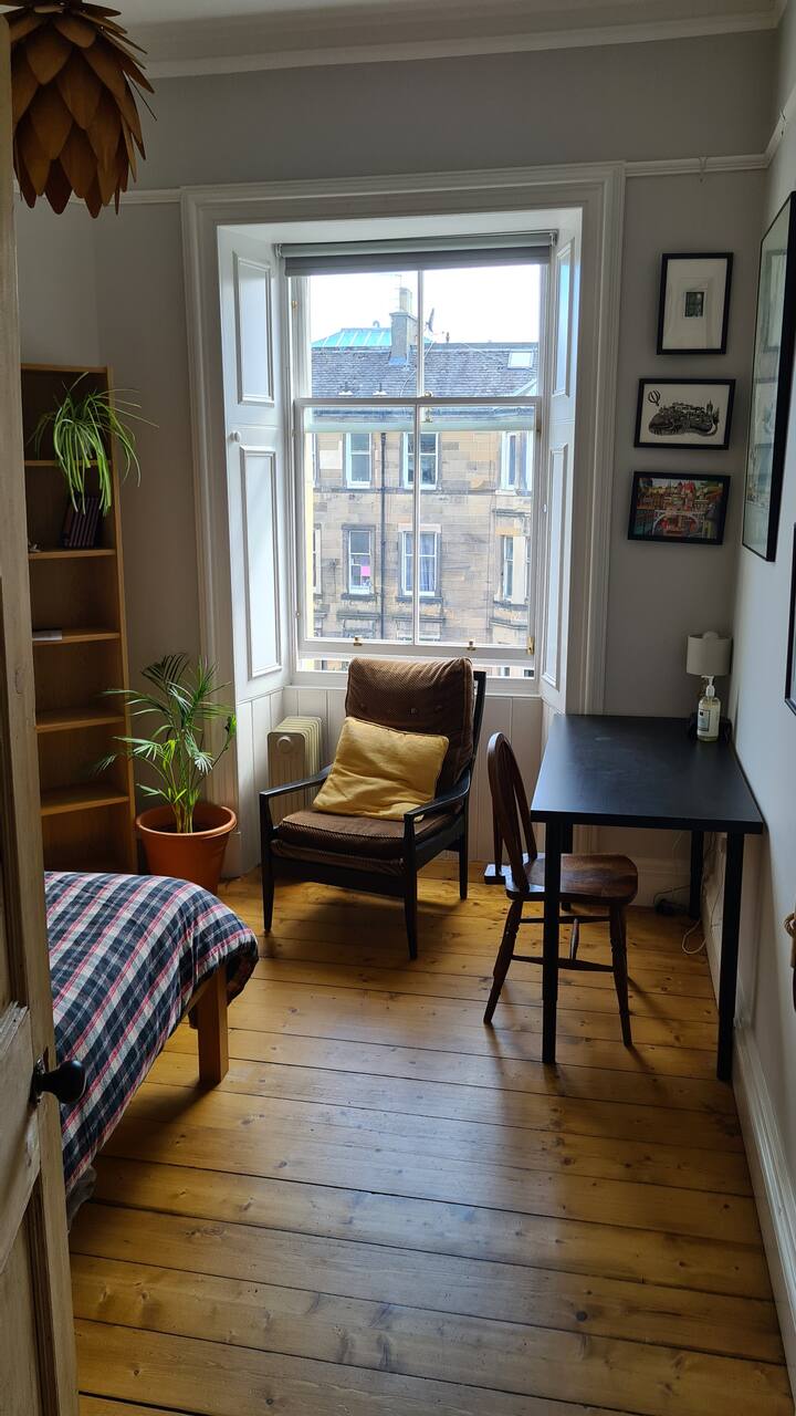 Ფართო ოთახი ცალკე სააბაზანოთი ამ მშვიდ მე-3 სართულზე, ტრადიციულ ვიქტორიანულ ბინაში, ცენტრალურ ედინბურგში. Იდეალურია მათთვის, ვისაც ქალაქის ცენტრიდან მშვიდი ოაზისი სურს, თანაც ყველაფერი ადვილად მისადგომია. Ტრამვაისა და ავტობუსის მარშრუტებთან და ქალაქის ცენტრთან, ძველ და ახალ ქალაქებთან, პრინს-სტრიტთან, როიალ მილთან, კალტონ-ჰილთან და ჰოლიროდ პარკთან და ართურსის სავარძელთან ახლოს, ასევე, ლეით-ვოლსა და მის შემოგარენში.