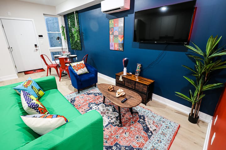 Შეაბიჯეთ ფილლის დროის კაფსულაში! Ეს ელეგანტური 1-საძინებლიანი ბინა, Eagles-ის თემატური იერსახით, თანამედროვე კომფორტს ძველებურ ჩურჩულებთან ერწყმის. Ჩაიძირეთ პლუშის საწოლში ქალაქის თავგადასავლების შემდეგ. Გაათავისუფლეთ თქვენი შიდა შეფ-მზარეული სრულად აღჭურვილ სამზარეულოში, შემდეგ კი შეიკრიბეთ მზით გაჟღენთილ საცხოვრებელ სივრცეში ფილმების ღამის გასათევად სმარტ-ტელევიზორში.