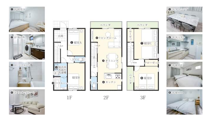 Wa-no-Ie Aozora | ცალკე ვილა ტენჩაიას სადგურზე, ფეხით 4 წუთის სავალზე მეტროსადგურამდე, 4 საძინებელი, იძინებს 10 ადამიანამდე