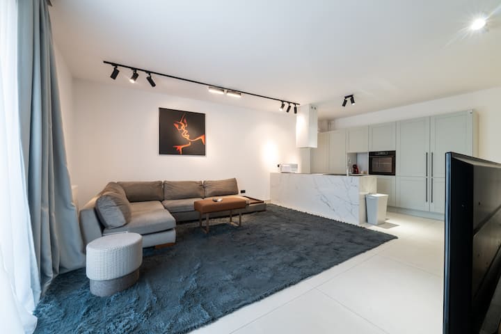 Თანამედროვე ქალაქის ბინა ტერასითა და ღია საცხოვრებლით