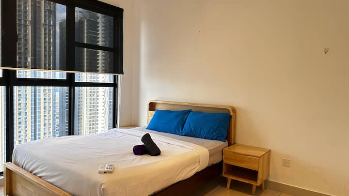 _ამ ბინაში არის 1 საძინებელი, 1 საწოლი 152 × 203 სმ, აივანი KLCC ხედით, სამუშაო მაგიდა და 2 სკამი.
