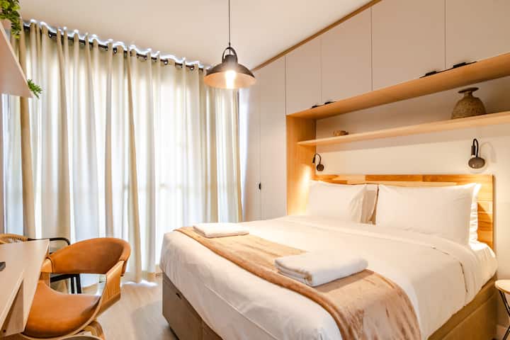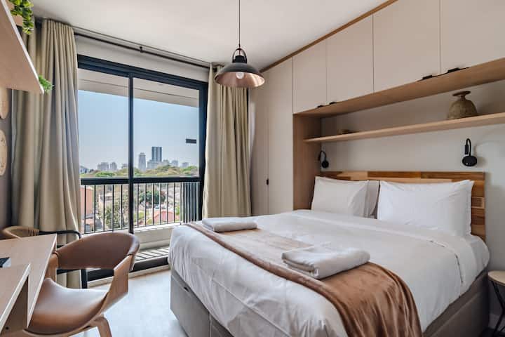 30 კვ/მ სტუდიო დიდი ზომის საწოლით, კონდიცირებითა და სმარტ-ტელევიზორით ციფრული ანტენით, იდეალურია მაქსიმუმ 2 ადამიანისთვის. Მას აქვს სამუშაო მაგიდა ორი სკამით სასადილო ან სახლის ოფისისთვის და სამზარეულო აღჭურვილია მაცივრით, მიკროტალღური ღუმელით, ორწვერიანი ინდუქციური გაზქურის ზედაპირით და ღუმელით.