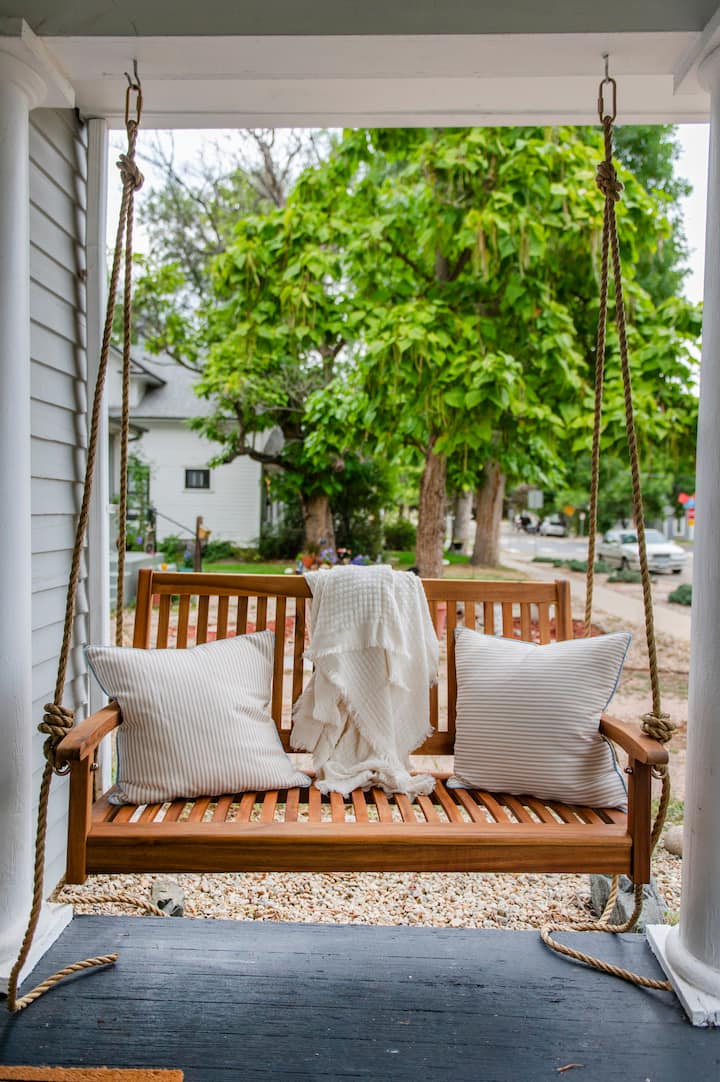 Წინა ვერანდა: დაისვენეთ ფართო წინა ვერანდაზე, სადაც დგას ორი მყუდრო სკამი, დიდი საქანელა და ორი პატარა საქანელა - იდეალურია დილის ყავის დასალევად ან ოჯახთან და მეგობრებთან ერთად მშვიდი დროის გასატარებლად.