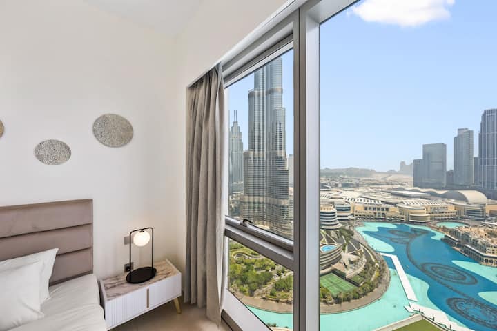 ✦ ელეგანტური 2-საძინებლიანი ბინა 34-ე სართულზე, Grande Signature Residences-ში, 1 დიდი საწოლი + 2 ერთადგილიანი საწოლი, დივანი-საწოლი და ბურჯ-ხალიფასა და დუბაის შადრევნის განსაცვიფრებელი ხედები.