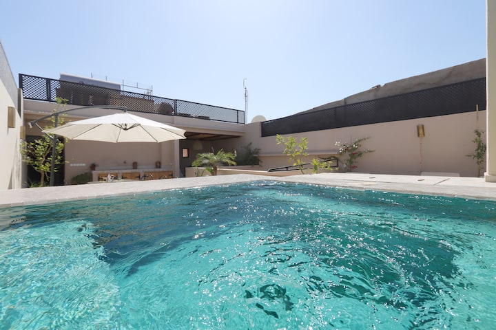 Ისიამოვნეთ ექსკლუზიური შთაბეჭდილებით რიად-როზაში. Ჩვენი დასაქირავებელი საცხოვრებელი მოიცავს მთლიანად რიადს თქვენთვის და თქვენი ჯგუფისთვის, რომელშიც შედის დასუფთავების მცირე მომსახურება და საუზმე . Ეს 4-საძინებლიანი რიადი ელეგანტურად აერთიანებს თანამედროვეობასა და ტრადიციას და გთავაზობთ მყუდრო პატიოს, გამაგრილებელ აუზს ტერასაზე, რომელიც მთელი წლის განმავლობაში მზიანია.