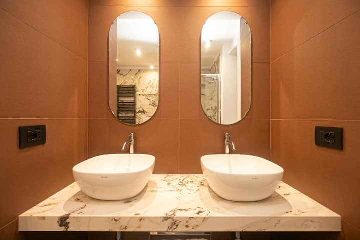 ელეგანტური და მკვეთრი სააბაზანო ორი ნიჟარით, შესანიშნავი სამმაგი საშხაპით და მარმარილოს კედლებით თბილ, სასიამოვნო ტონებში.