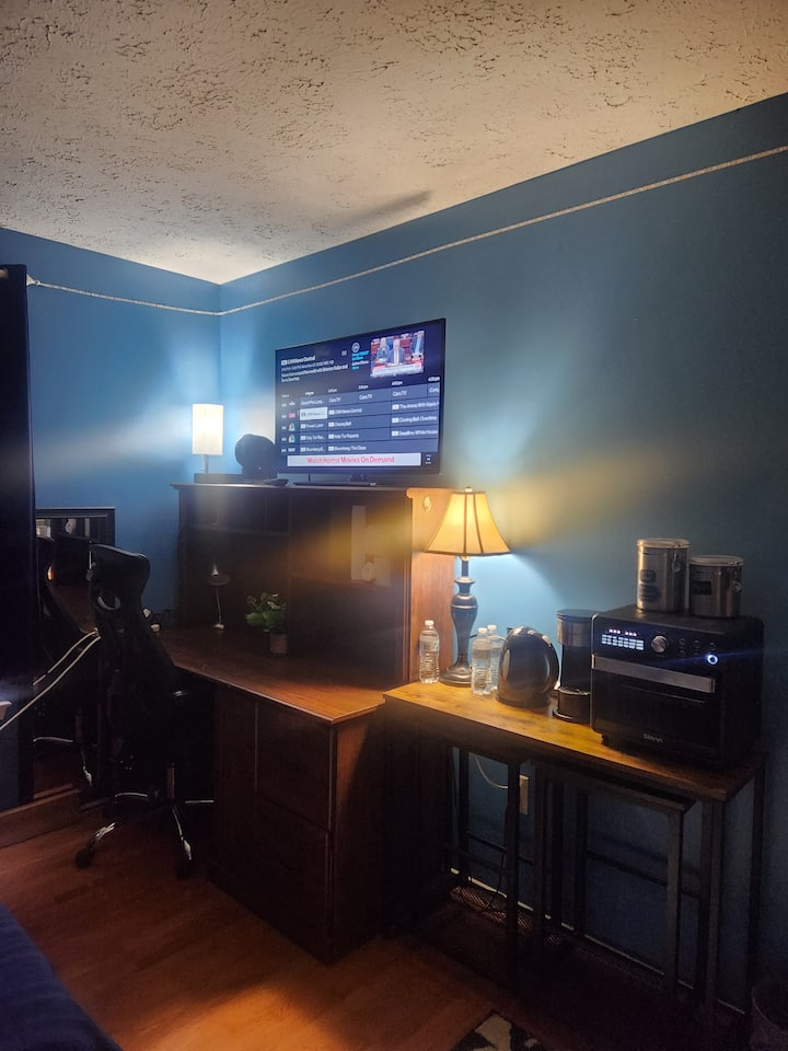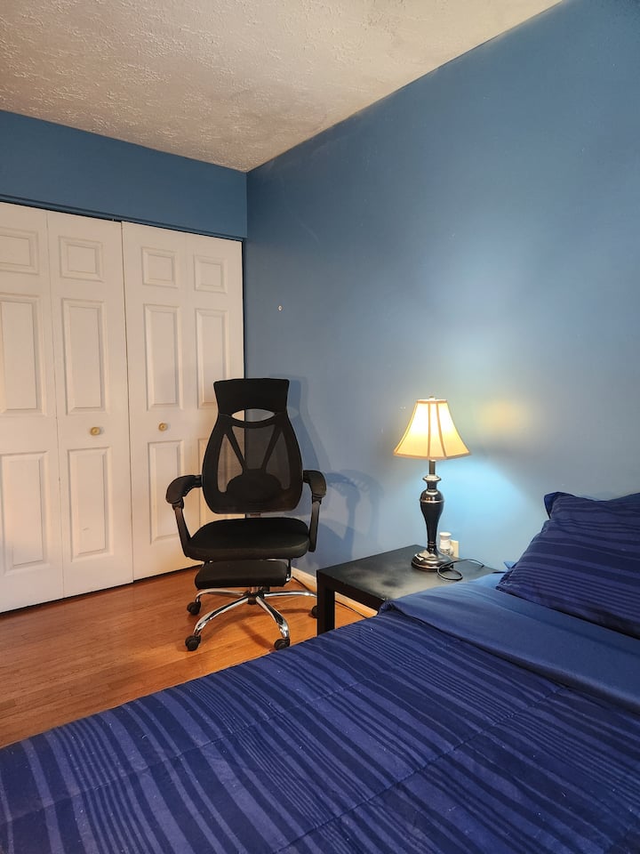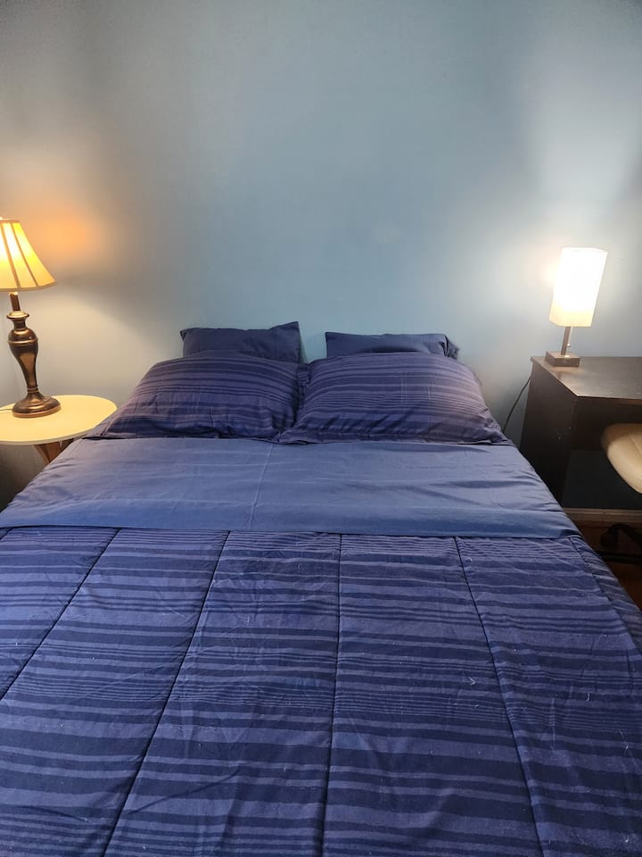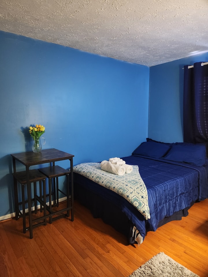 Ლურჯი ოთახი ორადგილიანი საწოლითა და კარის საკეტით