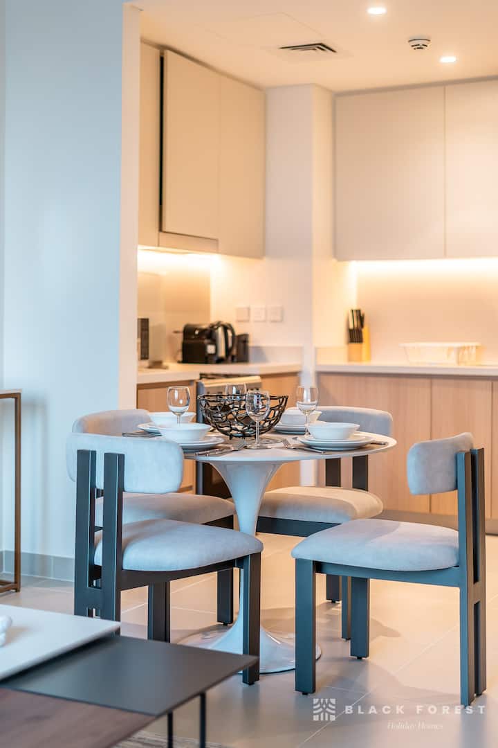 Მიმდებარე სასადილო სივრცე მრგვალი მაგიდით და ელეგანტური სკამებით გიწვევთ საღამოს კერძების ან ჭიქა ღვინის გასაზიარებლად. Სამზარეულოსთან ღია კავშირი ქმნის ჰარმონიულ, ფართო სივრცეს, სადაც ცხოვრობენ, ჭამენ და ტკბებიან სტილის ნაზავით.