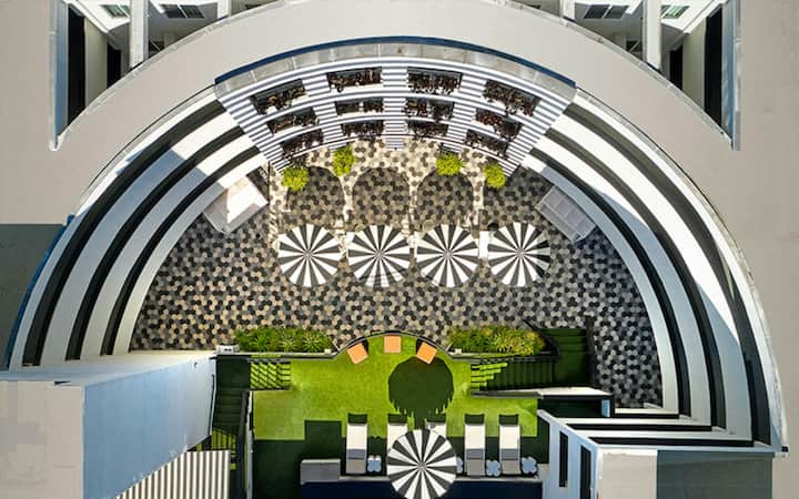 დაბინავდით ამ არტ‑დეკოს ნიმუშში დასავლეთ ჰოლივუდში, სადაც მეტალი, სარკეები და წვრილზოლები ბრწყინავს. მისი 32 ოთახი გარშემო ღია ეზოს აქვს.