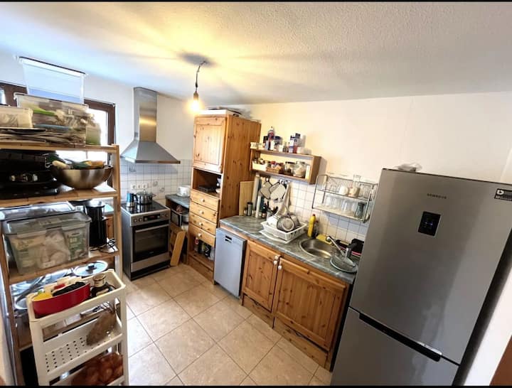 სტუმრებს ექნებათ ექსკლუზიური წვდომა მთლიან ბინაზე, მათ შორის, ცალკე შესასვლელზე, პირველ სართულზე მდებარე ლიფტზე და ტერიტორიაზე უფასო პარკირების ადგილზე. დამოუკიდებელი დაბინავება მოქნილობას გაძლევთ, ბინა კი გთავაზობთ საძინებელს, რომელშიც king‑size ზომის საწოლია, მყუდრო მისაღებ ოთახს დამატებითი საძილე ადგილით, სრულად აღჭურვილ სამზარეულოსა და თანამედროვე საყოფაცხოვრებო პირობებს. დატკბით კომფორტით და სივრცით მშვიდ, ოჯახებისთვის შესაფერის უბანში, რომელიც ბებლინგენის ცენტრთან და სატრანსპორტო კვანძებთან ახლოს მდებარეობს.
