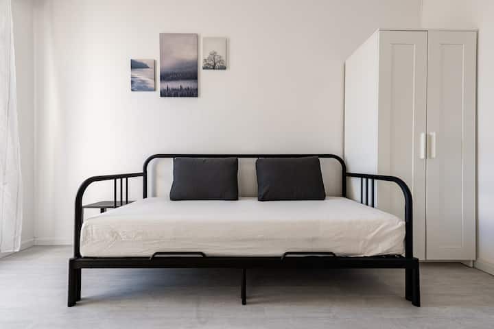 მეორე ოთახი უნივერსალური და მრავალფუნქციური სივრცეა. ორი კომფორტული სამუშაო მაგიდა ერგონომიული სკამებით იდეალურია საქმიანი მოგზაურებისთვის ან სტუდენტებისთვის, რომლებსაც კონცენტრირებისთვის მშვიდი გარემო სჭირდებათ. დიდ ორმაგ დივან‑საწოლზე კომფორტულად იტევა ორი ადამიანი, ამიტომ ოთახი შესანიშნავად გამოდგება საძილედ. პრაქტიკული გარდერობი ტანსაცმლისა და პირადი ნივთების მოსახერხებლად შენახვაში დაგეხმარებათ, რაც საცხოვრებელს მოწესრიგებულსა და ფუნქციურს გახდის.