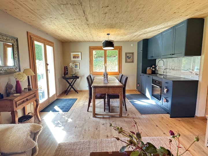 მყუდრო ალპური ბინა ბაღისა და მთის ხედით