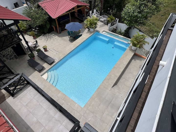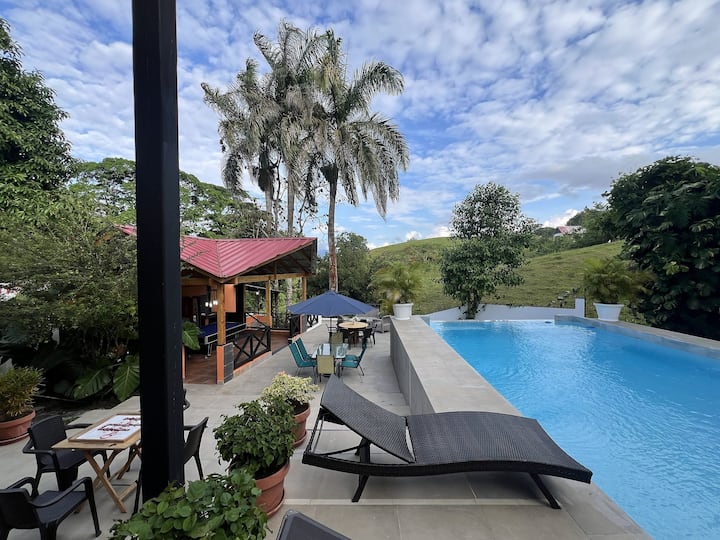 - დაფარული ტერასა და ზედა აივანი პატიოს, აუზისა და ბუნების ხედით