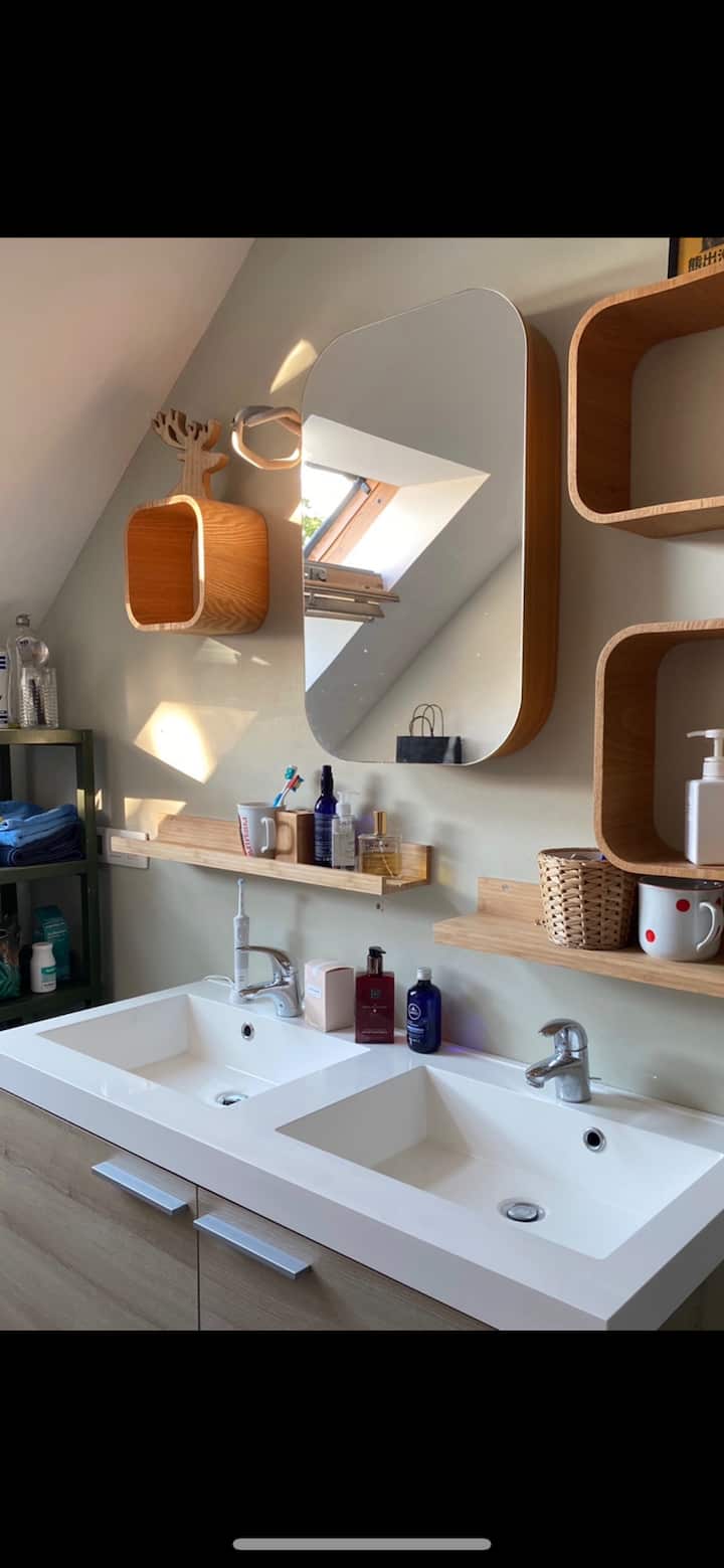 გთავაზობთ სუფთა და კომფორტულ საცხოვრებელს, რომელიც პატარა სახლის ზედა სართულს იკავებს. (ჩვენ ვცხოვრობთ პირველ და მეორე სართულზე)