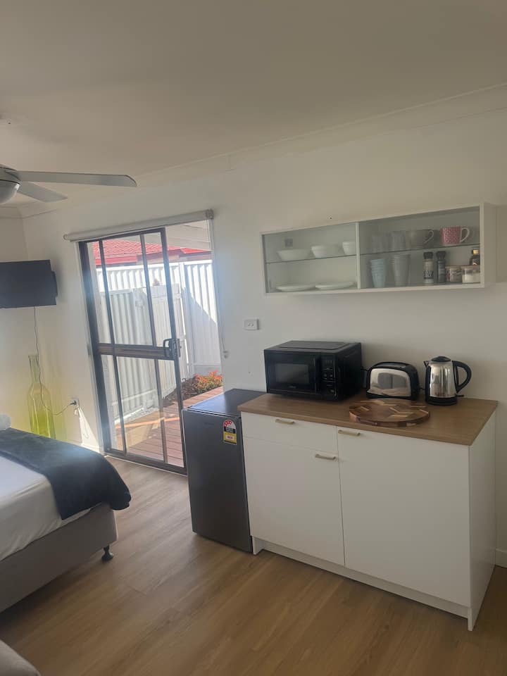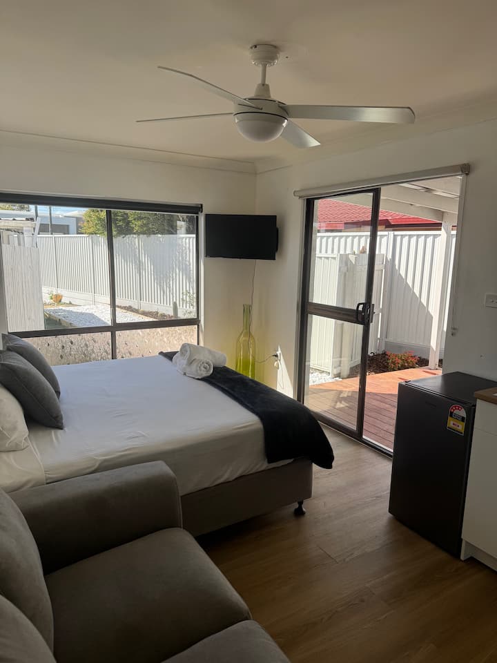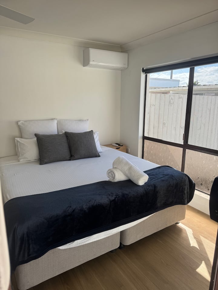 სტუდიოს ტიპის საცხოვრებელი სანაპიროზე შესაფერისი შინაური ცხოველებისთვის, საძინებელი 193×203 სმ‑იანი საწოლით.