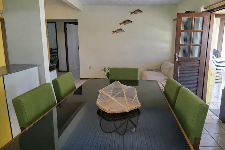 სასტუმრო მყუდრო, კარგად განათებული და სახლის სხვა სივრცეებთან ინტეგრირებულია. Conta com sofa de dois lugares, mesa com seis cadeiras, armário e uma decoração leve que transmite conforto e acolhimento. ფართო კარები უზრუნველყოფს კარგ ვენტილაციასა და ბუნებრივ სინათლეს, რაც ქმნის სასიამოვნო გარემოს საუბრებისთვის, კვებისა და ოჯახთან ერთად დასვენებისთვის.