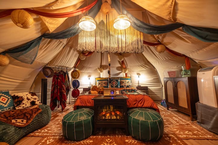Შეაბიჯეთ ჩვენს ლამაზად ბოჰემურ დეკორატიულ იურტაში, რომელიც აღჭურვილია სრული კომფორტისა და კომფორტისთვის!