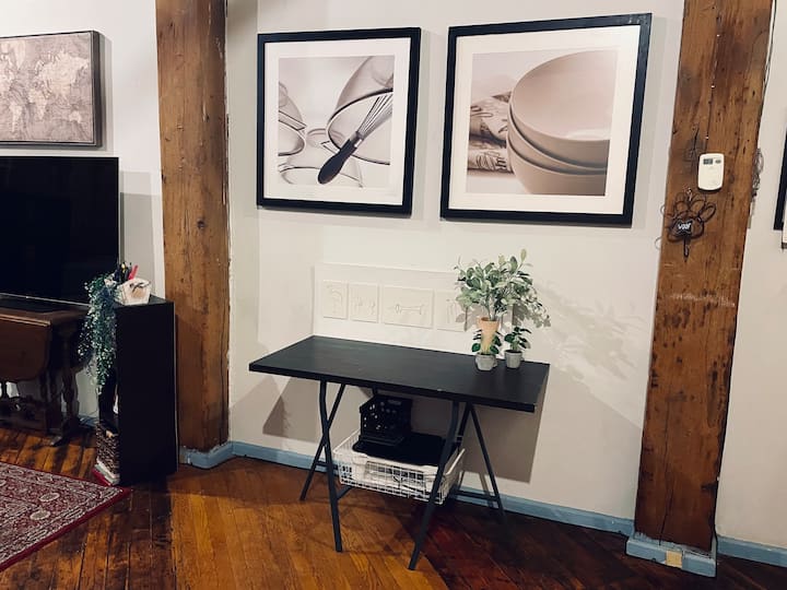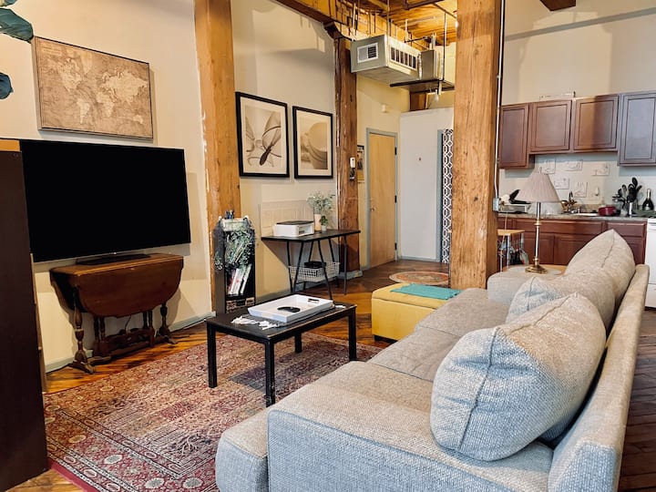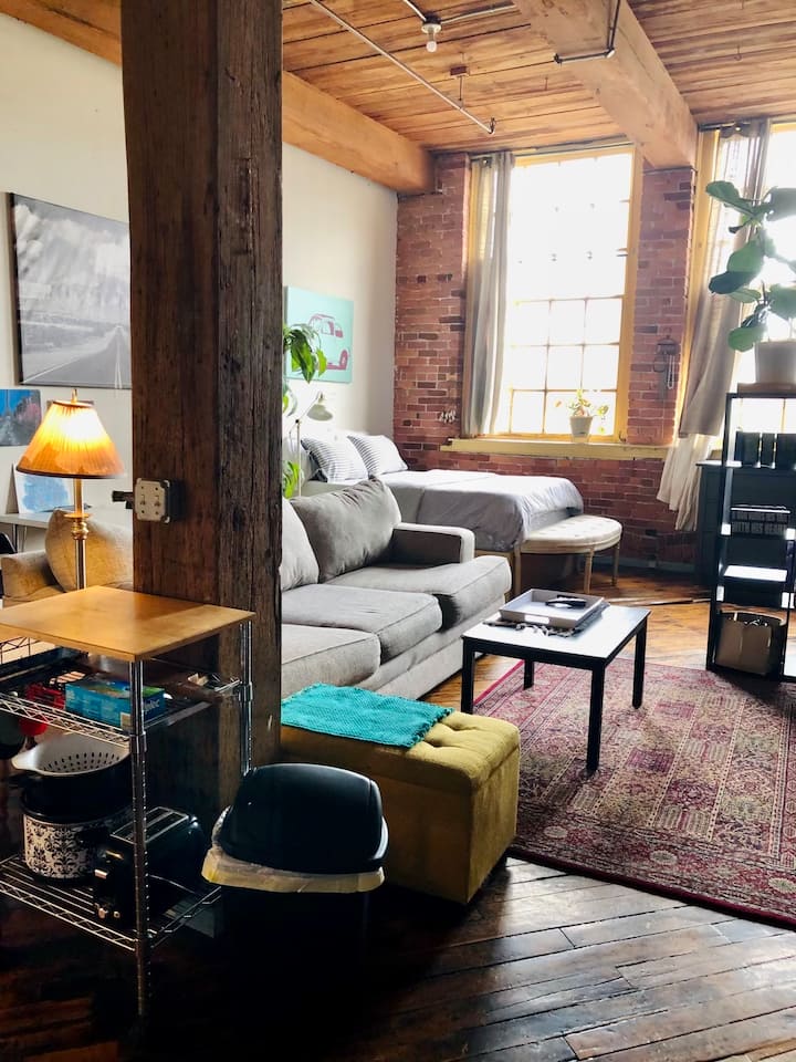 მომხიბვლელი ინდუსტრიული სტილის ლოფტი დეტროიტის მდინარეზე