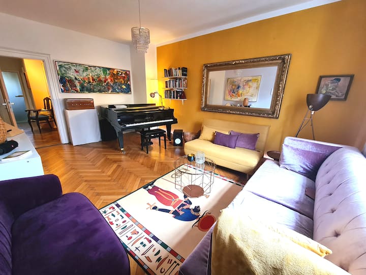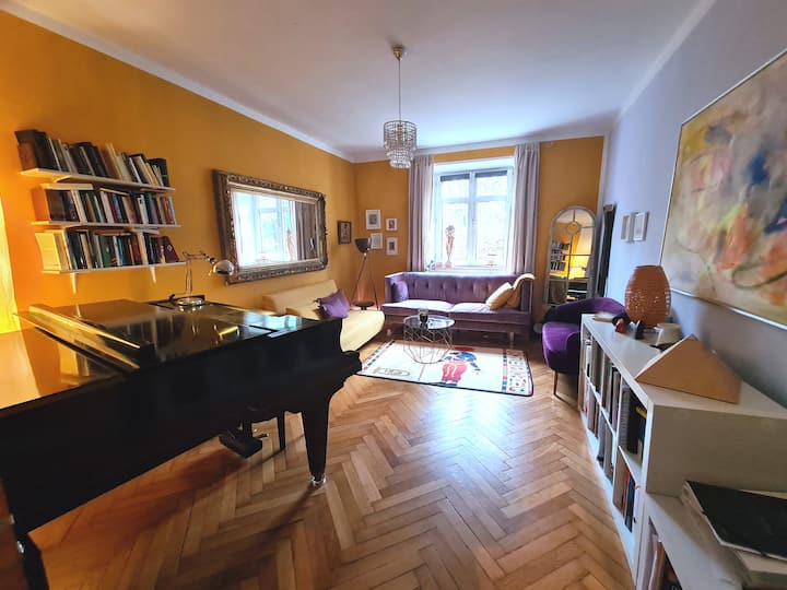 ლამაზი მხატვრის ბინა გრანდიოზული ფორტეპიანოთი