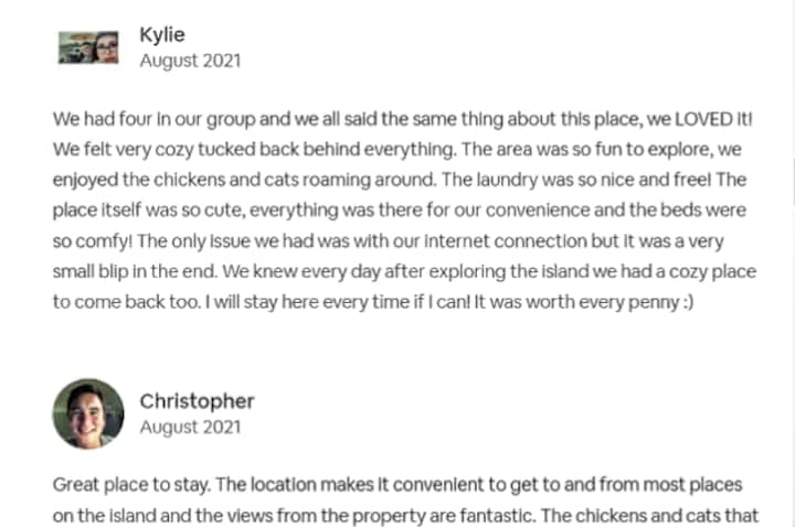 Როგორც მოგეხსენებათ, მთელ კუნძულ კაუაიში მრავლადაა გარეული მამლები და ქათმები და მათ უყვართ საცხოვრებელთან ახლოს დაკიდება. Სიბნელის შემდეგ (როცა ღრიალებენ) საღამოს, როგორც წესი, მშვიდად არიან, მაგრამ ღამის უცნაურ საათებში იღვიძებენ და ყვირიან. Ზოგს პირველი დღიდანვე სძინავს, სხვები კი ამბობენ, რომ 1-2 ღამის შემდეგ ეჩვევიან - განსაკუთრებით, თუ დატვირთული, აქტიური დღეები აქვთ და დასაძინებლად ზონკავენ. Ჩვენ ვერაფერს ვაკეთებთ მამლის ტანისამოსის საათებთან დაკავშირებით, მაგრამ სტუმრებს ვთავაზობთ ჰერმეტულად დალუქულ ყურსასმენების პაკეტებს დასაძინებლად. Ასევე, ღამის საათებში კონდიციონერის ან/და ვენტილატორების გაშვება ხელს უწყობს ყვირილის ხმის დაბლოკვას. ზოგიერთს ქათმები და მამალი მოსწონს (ბევრი სტუმარი მათ ფოტოებს იღებს!). Სხვები მათ შემაშფოთებლად აქცევენ. Მაგრამ ისინი კაუაიში ცხოვრების ფაქტია. Სტუმრებს ვთხოვთ, არ გამოკვებონ და არ წაახალისონ, თუმცა ისინი მუდმივი ფრინველები არიან. Ჩვენ ვაძლევთ ჩვენს ძაღლს, რომ კვირაში ერთხელ დასდევდეს ქათმებს, მაგრამ ქათმები სწრაფად ბრუნდებიან. Ფაქტია, რომ ქათმები მთელ კაუაიზე არიან. კაუაის ოლქის საბჭომ, შესაძლოა, მალე მიიღოს კანონი, რომლის თანახმადაც ყველა სტუმარი ვალდებული იქნება, ორი მამალი წაიღოს!