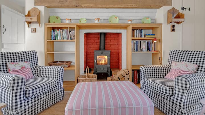 Ეს მყუდრო ოთახი კოტეჯის შუაგულია, შეღებილი ორიგინალური ხის იატაკითა და კოჭებით, მხიარული ყვავილების ფარდებითა და კომფორტული დასაჯდომით, მათ შორის, ორი სავარძელითა და სამადგილიანი დივნით. Შეშის მიმზიდველი ღუმელი მდებარეობს თავდაპირველ აგურის ბუხარში, რომელიც ჩარჩოშია მოქცეული მუხის ხელნაკეთი წიგნების ყუთებით. Ეს შესანიშნავი ადგილია ცეცხლის გვერდით მოკალათებისთვის წიგნით ხელში ან ჭკვიანი ტელევიზორის საყურებლად, რომელიც შეგიძლიათ იპოვოთ ანტიკვარული ფიჭვის კუთხის კარადაში, DVD-დამკვრელთან, Bluetooth დინამიკთან და თამაშებისა და თავსატეხების არჩევანთან ერთად. Თბილ საღამოებზე გააღეთ ფრანგული კარები, რომ საღამოს ჩაის ფინჯნის შემდეგ ბაღში გახვიდეთ და შესანიშნავი ხედები დაათვალიეროთ.