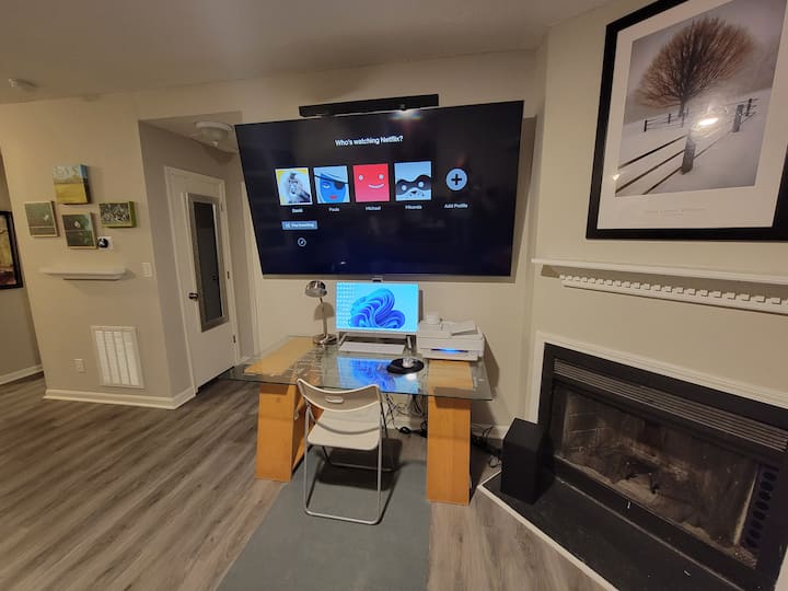 მაღალი გარჩევადობის 82‑დუიმიანი ტელეეკრანი და Amazon Prime Video, Apple TV, Netflix