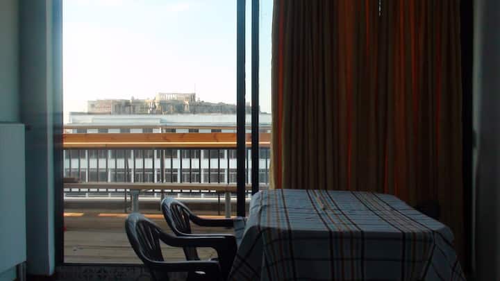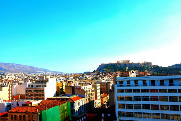 8 ‡სტუდენტური ეკონომიკის ოთახი და აკროპოლისის ხედი აივანზე
