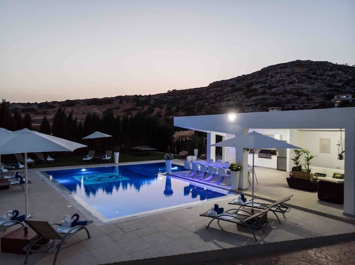 Შთამბეჭდავი 7-საძინებლიანი ვილა, რომელშიც არის პირადი აუზი, ჯაკუზი/ჰიდრომასაჟიანი აუზი, მზის პავილიონი, კერძო ბაღები, საბავშვო სათამაშო მოედანი და მისალმების აუზი.