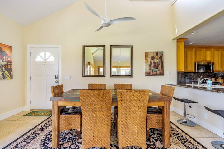 Სამზარეულოში არის გრანიტის დახლი და სრულად მარაგდება ჭურჭლით და რამდენიმე წვრილი საყოფაცხოვრებო ტექნიკით, ანუ ყავის ქვაბით, ბრინჯის გაზქურით და ა.შ. Მისაღებ ოთახში არის ახალი ავეჯი და დიდი ბრტყელეკრანიანი ტელევიზორი საკაბელო ტელევიზიით. Სწრაფი wi-fi მთელ სახლში. Მისაღები ოთახის გარეთ არის დიდი ლანაი გარე სასადილო ოთახისთვის და ლამაზი ხედი მთაზე. Თუ გსურთ სტეიკებისა და ბოსტნეულის გრილზე შეწვა, აუზის ტერიტორიაზე განთავსებულია გაზის გრილები