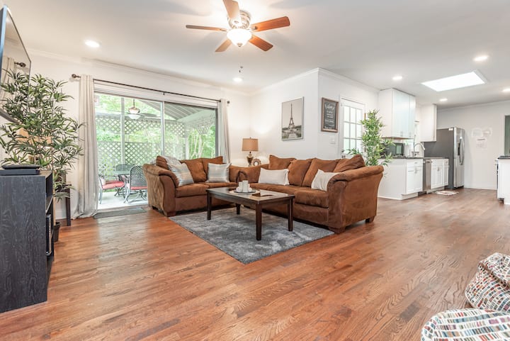 • 🛋📺🚪 მისაღები ოთახი: HD ტელევიზორი Smart Roku მოწყობილობით და წვდომა დახურულ უკანა ვერანდაზე.