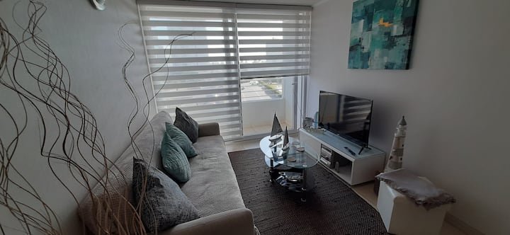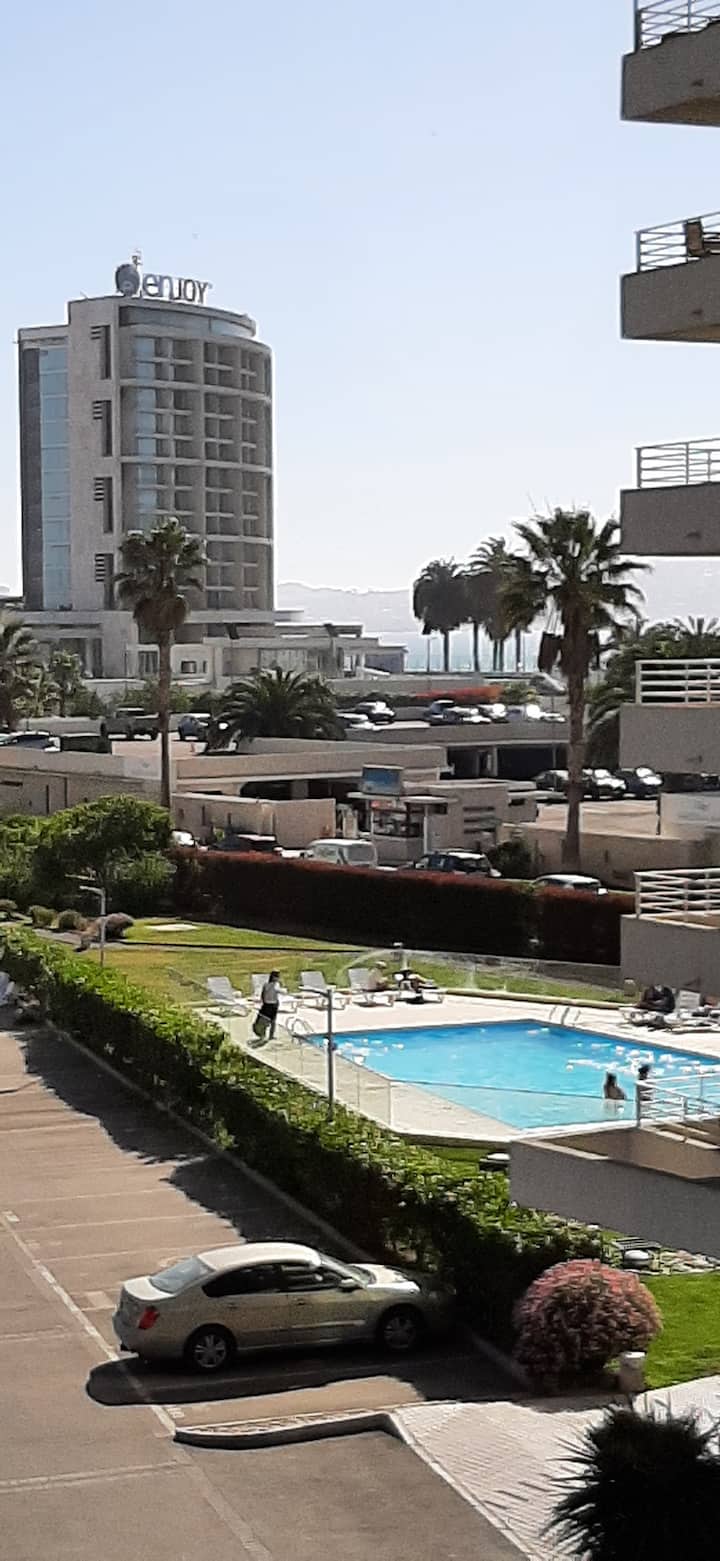 ლამაზი ბინა შიდა პარკირების ადგილით შესასვლელ კართან, რომელიც მდებარეობს მეორე ხაზზე (Avenida Los Pescadores 5401, Condominio Marina Océano), სანაპიროდან, Avenida de Mar‑დან და Enjoy Casino‑დან რამდენიმე მეტრში.