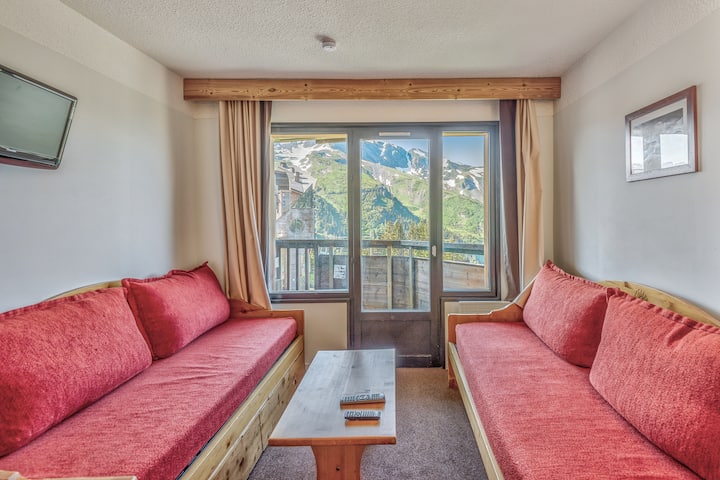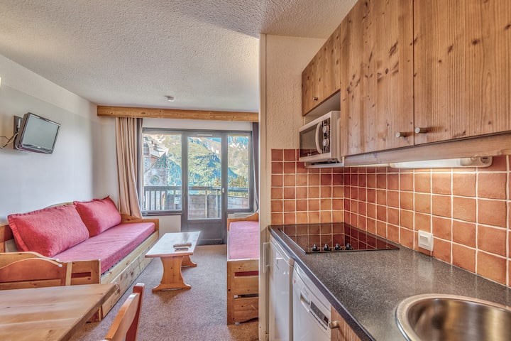 Დასაქირავებელი საცხოვრებლის უპირატესობები: სტუდიო ფერდობებზე პირდაპირი წვდომით, რომელიც მდებარეობს მე-5 სართულზე, სამხრეთით მდებარე აივნით.