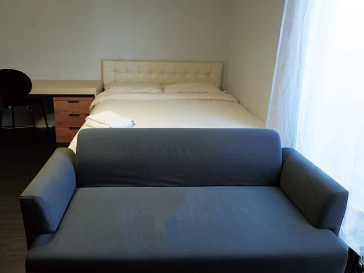 Ორადგილიანი საწოლი (150 სმ x 190 სმ), აივნის იატაკიდან ჭერამდე ფანჯრები უამრავი განათებით, ფართო სააბაზანოთი