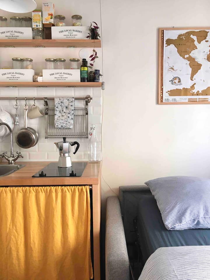 ოთახშია პატარა საშხაპე ოთახი პატარა საშხაპითა და სანიტარული ტუალეტით, ასევე კარგად მოწყობილი პატარა სამზარეულო 10 მ²‑იან პატარა სივრცეში. Ყველა კომფორტი თქვენი სტუმრობისთვის.