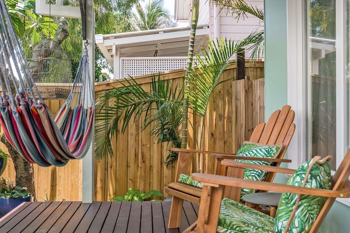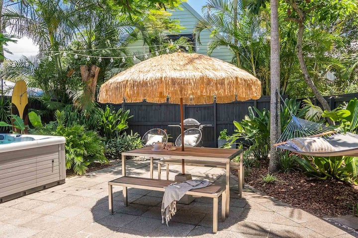 Ლამაზად გარემონტებული 4-საძინებლიანი სახლი პლაჟთან რამდენიმე წუთში და ფეხით სავალზეა ბაირონის ყურედან და #039; ცენტრი, რომელშიც არის ჰიდრომასაჟიანი აუზი და მშვიდი ტროპიკული ბაღები.