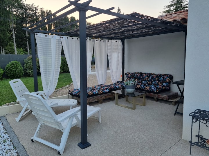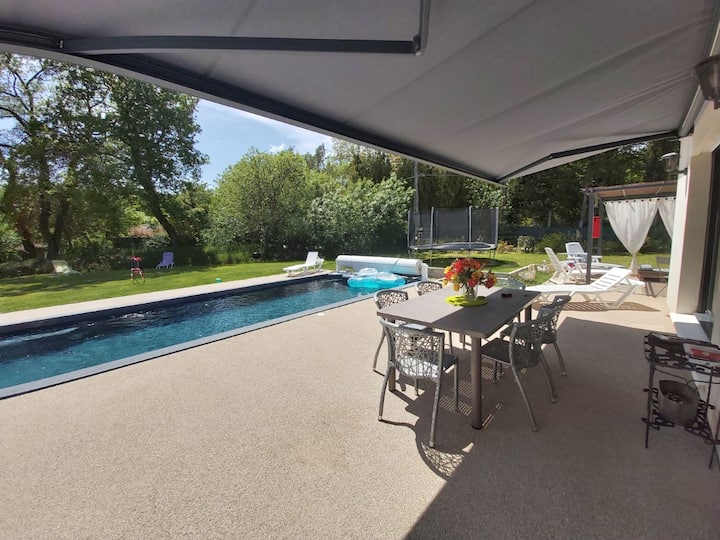 ახალი, თანამედროვე, ერთსართულიანი სახლი პროვანსის სტილში. 4 ცალკე საძინებელი, რომელთაგან ერთ‑ერთს აქვს პირადი სააბაზანო. 57 მ²‑იანი მისაღები ოთახი, რომლიდანაც იშლება ხედი 4×10‑მეტრიანი საცურაო აუზისა და სპა‑ცენტრისკენ, ხოლო იქედან — 1000 მ²‑იანი ბაღისკენ. თეთრეულისა და პირსახოცების დამატებითი კომპლექტი კვირაში 45 ევროდ. ვლაპარაკობთ ინგლისურად