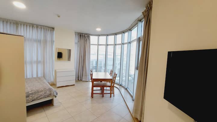 Სტუდიო შესანიშნავი ხედით, ქალაქის ცენტრთან ახლოს მდებარე უამრავი მაღაზიით