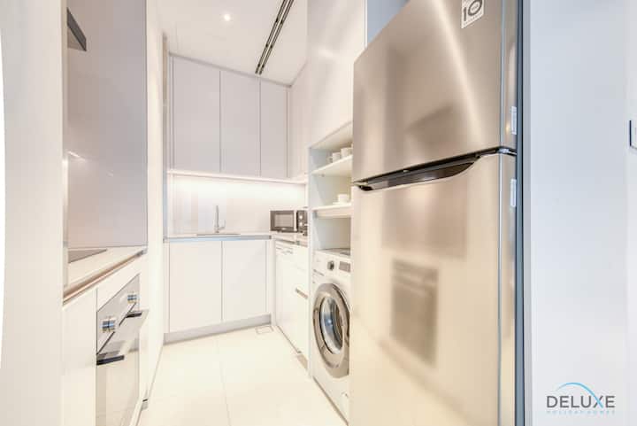 Პლაჟის 1BR მაღალსართულიანი კორპუსის გვერდით, არხის ხედებით