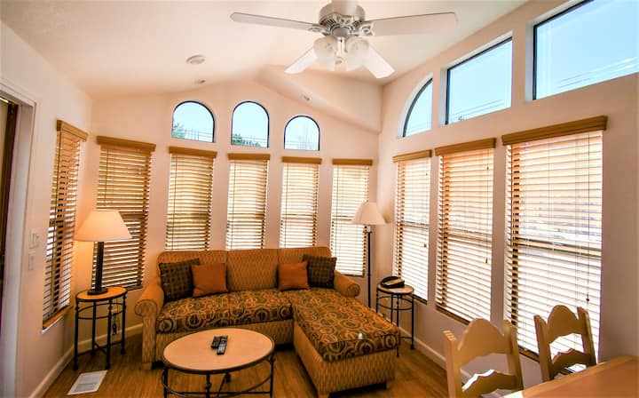 კომფორტი და სტილი. Ეს არის სიტყვები, რომლებიც თქვენს ლამაზ კოტეჯში შესვლისას მთავარ საძინებელში შედიხართ. 22" LCD ტელევიზორი დისტანციური, სარკისებრი კარადებით და, რა თქმა უნდა, მაღვიძარა იმ დილით ადრე დანიშნულებისთვის ბუნებასთან! შადრევნების სიმყუდროვე და სიმყუდროვე იდეალური საშუალებაა დასაძინებლად. არ აქვს მნიშვნელობა, მთელი დღე მთაში ლაშქრობაში გაატარეთ, ველოსიპედით სეირნობთ, სედონაში ყველა ხელოვნების გალერეის მონახულებას გეგმავთ თუ, უბრალოდ, აუზთან ისვენებთ, სედონა ფაინსში მომდევნო დღის თავგადასავლისთვის იდეალური ადგილი გაქვთ!