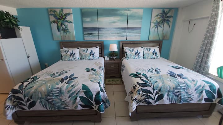 Სრულიად ----------------------------------------------------------ახალი განცხადება და ლამაზი ოთახი ტროპიკული თემატიკით ოკეანისპირა შენობაში. 2 ახალი დედოფლის საწოლები ოკეანის სამართლიანი ხედით, როცა საწოლზე დაწექით, რომ დაისვენოთ.