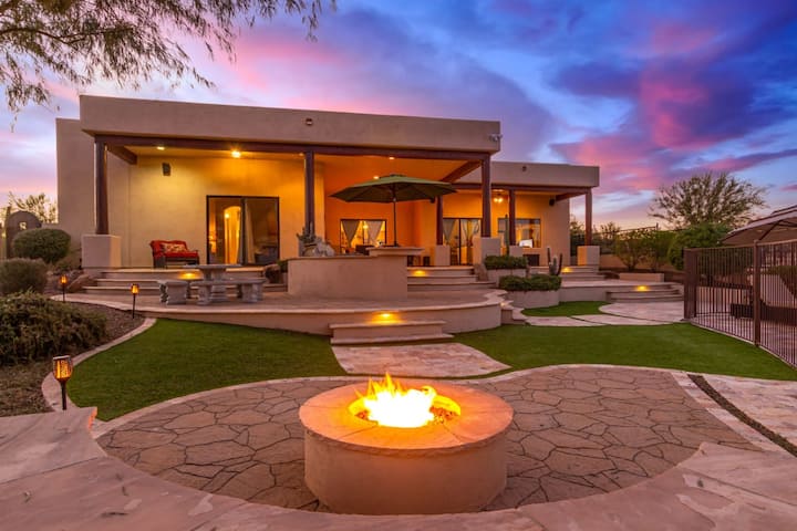 გარეთ უდაბნოს სილამაზე გელოდებათ. რამდენიმე დონეზე განლაგებული პატიოსგან იშლება მზის ჩასვლისა და ვარსკვლავებით მოჭედილი ღამის ხედები. აქვეა დასასვენებელი ადგილები კოცონის მაგიდასთან, 70‑დუიმიანი სმარტ‑ტელევიზორი, ჩაშენებული ბარბექიუს კუნძული ღია ცის ქვეშ სადილობისთვის და ქვის პიკნიკის მაგიდა, რომელიც იდეალურია ბრანჩისთვის ან საღამოს კერძებისთვის. გაატარეთ თბილი დღეები აუზსა და სპაში, ითამაშეთ კალათბურთი ნახევარ მოედანზე, გაისეირნეთ მალკოლიკურ ბილიკებზე გარე საშხაპემდე, ან ისიამოვნეთ ბოკჩით ღია ცის ქვეშ.