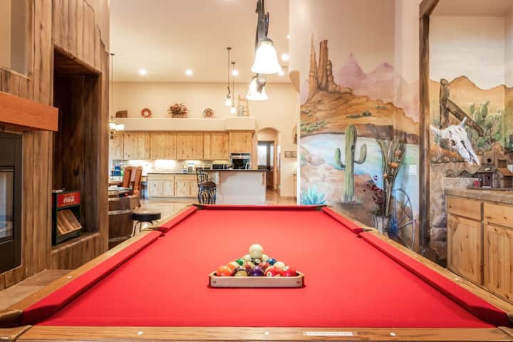 მოგესალმებით უდაბნოში მდებარე ამ დიდ სახლში, რომელიც 370 კვ.მ ფართობს იკავებს. აქედან მთების პანორამული ხედები იშლება, რაც დაუვიწყარ შეკრებებს შეუქმნის განსაკუთრებულ შტრიხს. თბილი ტექსტურები, ბუნებრივი ქვის დეტალები და კარგად გააზრებული სივრცეები ქმნის ატმოსფეროს, რომელიც ერთდროულად დახვეწილი და მყუდროა. ეს იდეალური ვარიანტია ოჯახური დასვენებისთვის, გოლფის თამაშისთვის ან სხვადასხვა ასაკის ადამიანებისთვის, რადგან ყველას ექნება საკუთარი სივრცე დასასვენებლად.